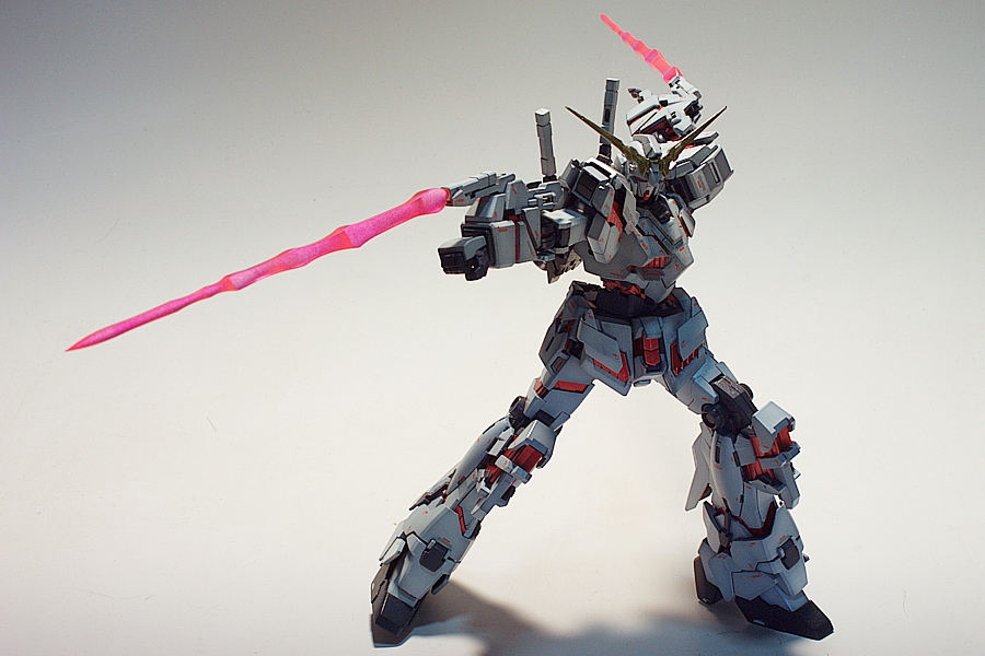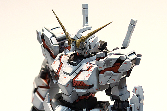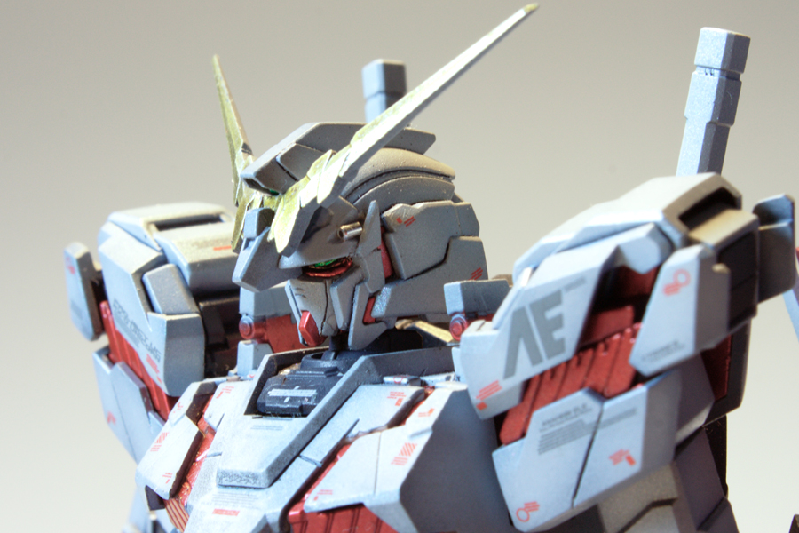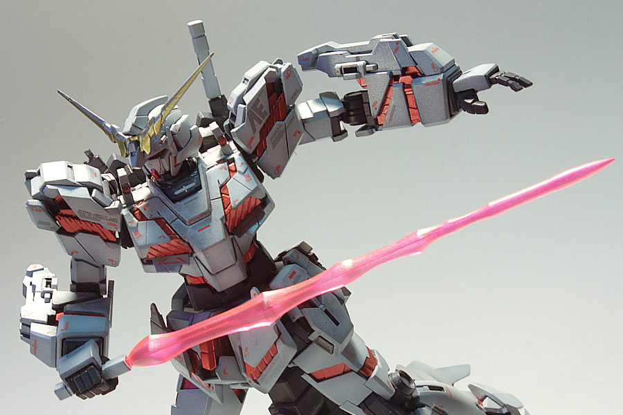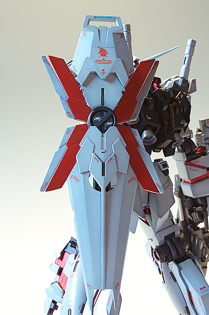下地は[G]EXブラック ↓ [Mr]スーパーメタリックの クロームシルバー ↓ [Mr]ダイヤモンドシルバー ↓ [Mr]クリアーレッド ↓ [Mr]ダイヤモンドシルバー ▲サイコフレーム部アップ ■:濃紺部分